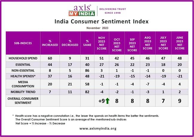 Bangalore: Axis My India, a leading consumer data intelligence company, unveils the latest insights from the India Consumer Sentiment Index (CSI), revealing noteworthy trends in consumer behaviour. The report showcases a diverse range of data, such as a surge in overall household spending for 60% of families, highlighting an uptick of 7% from the previous month. As the glow of Diwali approaches, the festive enthusiasm is palpable, as 25% of the respondents are gearing up to elevate their shopping endeavours during this season. Amid the festive hustle and bustle, a substantial 79% of respondents gravitate towards the timeless charm of cash for their transactions. Fashion seems to be a focal point for many, as an overwhelming 67% of the respondents are eager to rejuvenate their wardrobes in time for the celebrations. In the age of digital commerce, the affinity towards local brick-and-mortar stores stands out, with a large share of respondents indicating a potent sentiment of buying from local enterprises. In the backdrop of Diwali, marked by its iconic sales events and varied shopping experiences, the report’s findings radiate positivity. It suggests a season that promises to be rewarding for both businesses hoping to capitalise on the festive fervour and consumers looking to indulge in their festive shopping sprees.