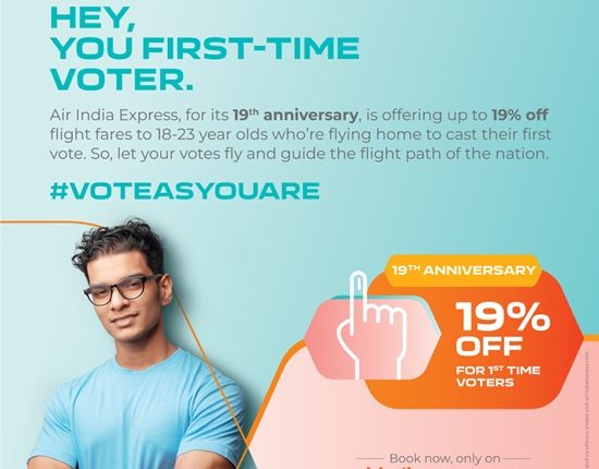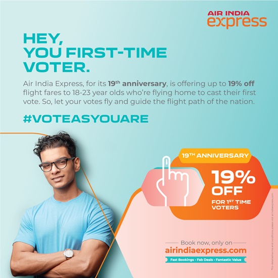 Bangalore: In the run up to its 19th anniversary on 29th April, the airline announced a campaign for first time voters, true to its legacy of connecting people, places, and cultures. Air India Express unveiled its #VoteAsYouAre initiative and campaign to empower and mobilise the youth of India to exercise their voting rights in the forthcoming 18th Lok Sabha elections. The airline is offering 19% off across its domestic and international network for first-time voters, between the ages of 18 and 22, flying to cast their votes. Bookings can be made on the airline’s award-winning mobile app and website, airindiaexpress.com for travel to the airport nearest to the respective constituency of the voter, between 18th April and 1st June 2024.