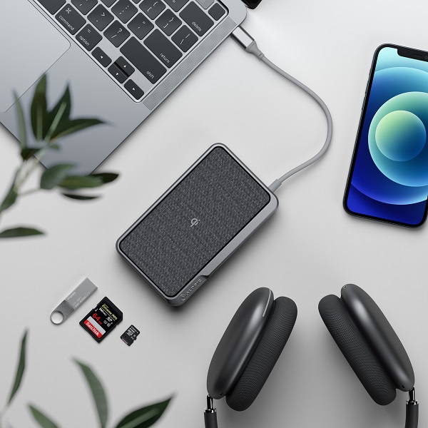 The elegant looking ULDWAV-SGR aka Dock Wave is the first of its kind, a 3-in-1 solution and the perfect travel companion. It expands on the conventional USB-C dock design by adding wireless charging and a built-in 5,000mAh power bank. Dock Wave is a well thought and practically engineered product, The connectors, buttons, and LED indicators are strategically located to lessen interference with cables and the wireless Qi charging pad. The LED indicators can be easily monitored and represent both the battery level and wireless Qi charging status. The dock features four LED indicators which represent 25% battery power increments while a fifth LED light indicates the wireless charger status. The Qi logo on the wireless charging pad acts as a visual guide for the optimal placement of your device over the wireless charging coil.