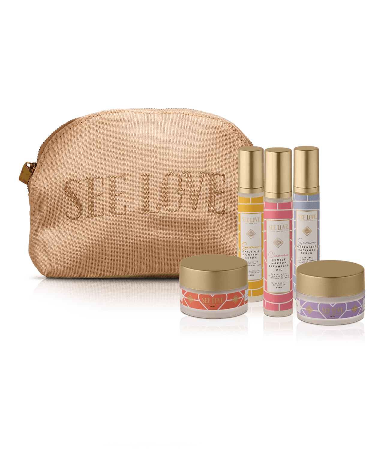 • See Love Minis Kit: This special starter set is a mini introduction to See Love skincare made with Kind-to-Skin ingredients for all your skincare needs, in handy travel sizes. Lovingly packed in a pretty peach See Love Pouch, handmade by artisans in collaboration with The Burlap People, it’s also perfect for gifting or holiday travel.