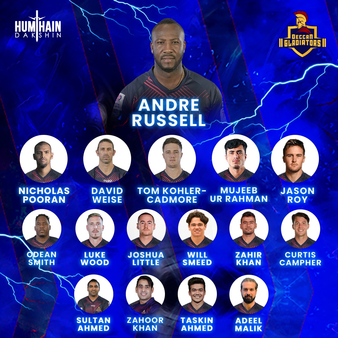 Deccan Gladiators has roped in young Afghan bowling sensation Mujeeb Ur Rahman, along with Luke Wood, Joshua Little, Will Smeed, Zahir Khan, Curtis Campher, Sultan Ahmed, Taskin Ahmed, and Adeel Malik.