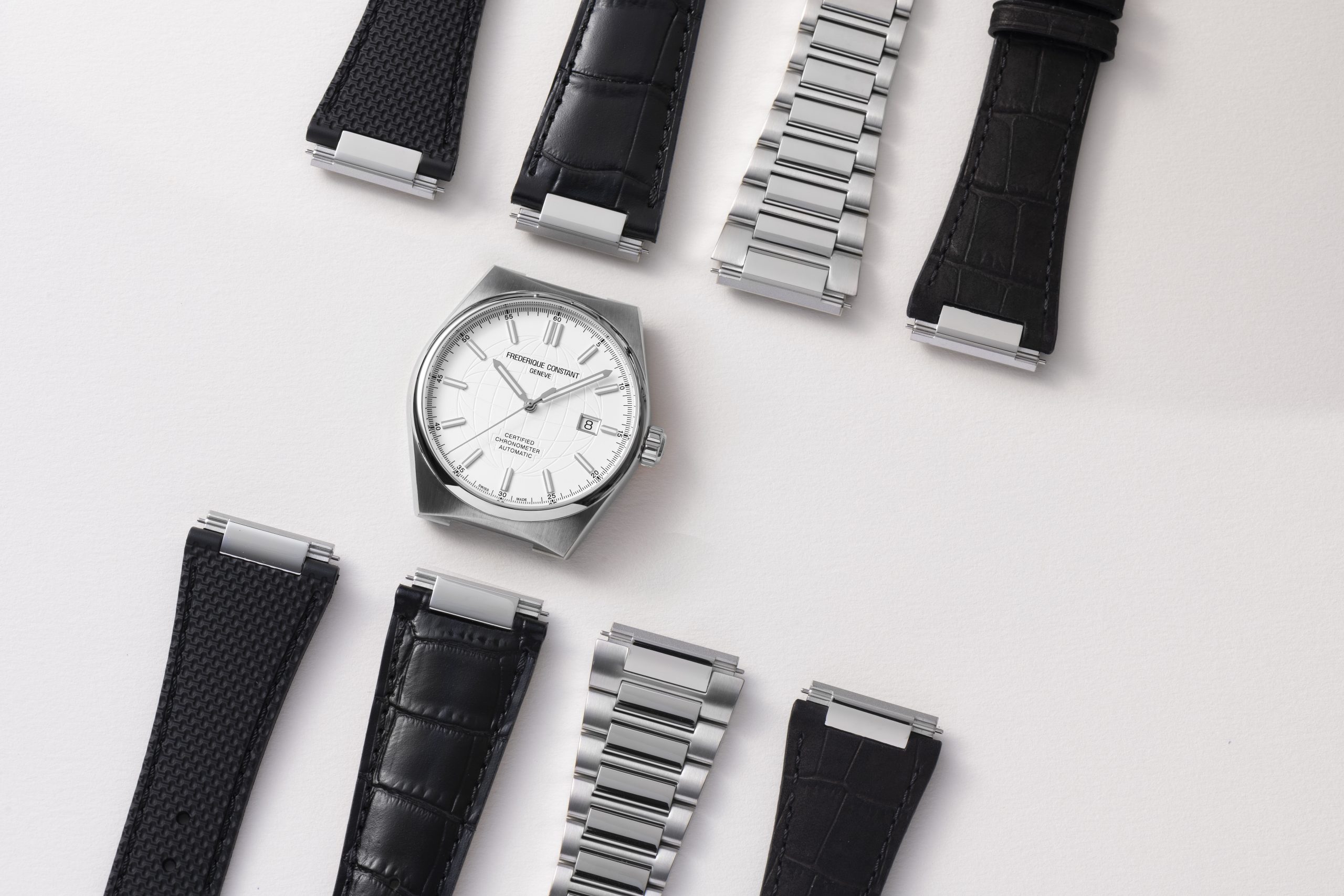 To switch between a sporty, urban, or stylish look, all you need to do is press on the two push-pins at the end of the bracelet or the strap to disconnect it from the case and, just as easily, click a new one into place. Frederique Constant supplies the new Highlife model with one alternatives at no additional cost. A leather strap is fitted as standard and accompanied by a second rubber strap. A set of three additional crococalf suede straps in brown, blue and black can also be purchased separately.