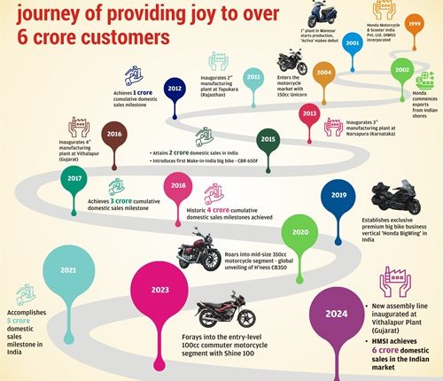 | 2024 | – Expands capacity with the inauguration of a new assembly line at 4th manufacturing plant Vithalapur (Gujarat)- Milestone: HMSI achieves 6 crore domestic sales in the Indian market |