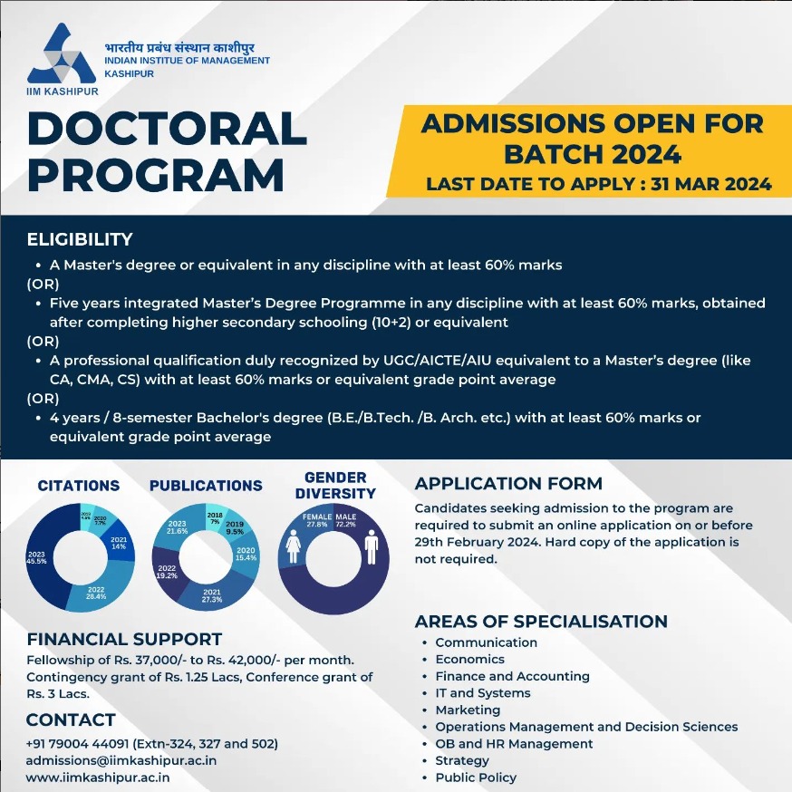 Aspiring researchers can apply by visiting IIM Kashipur’s official website. The last date to fill out the application form is March 31st, 2024.