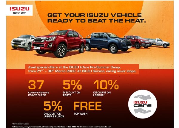 An initiative of ‘ISUZU Care’, the Pre-Summer service camp will be organised across all ISUZU authorised dealer service outlets, between 21sh and 30th March, 2022 (both days inclusive). During this period, customers can also avail special offers & benefits for their vehicles.
