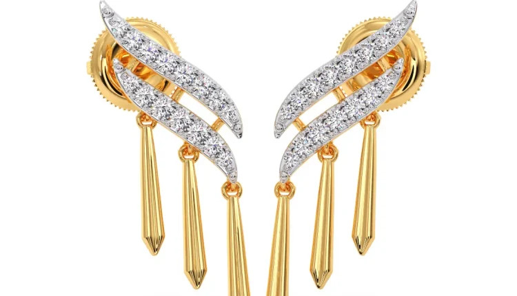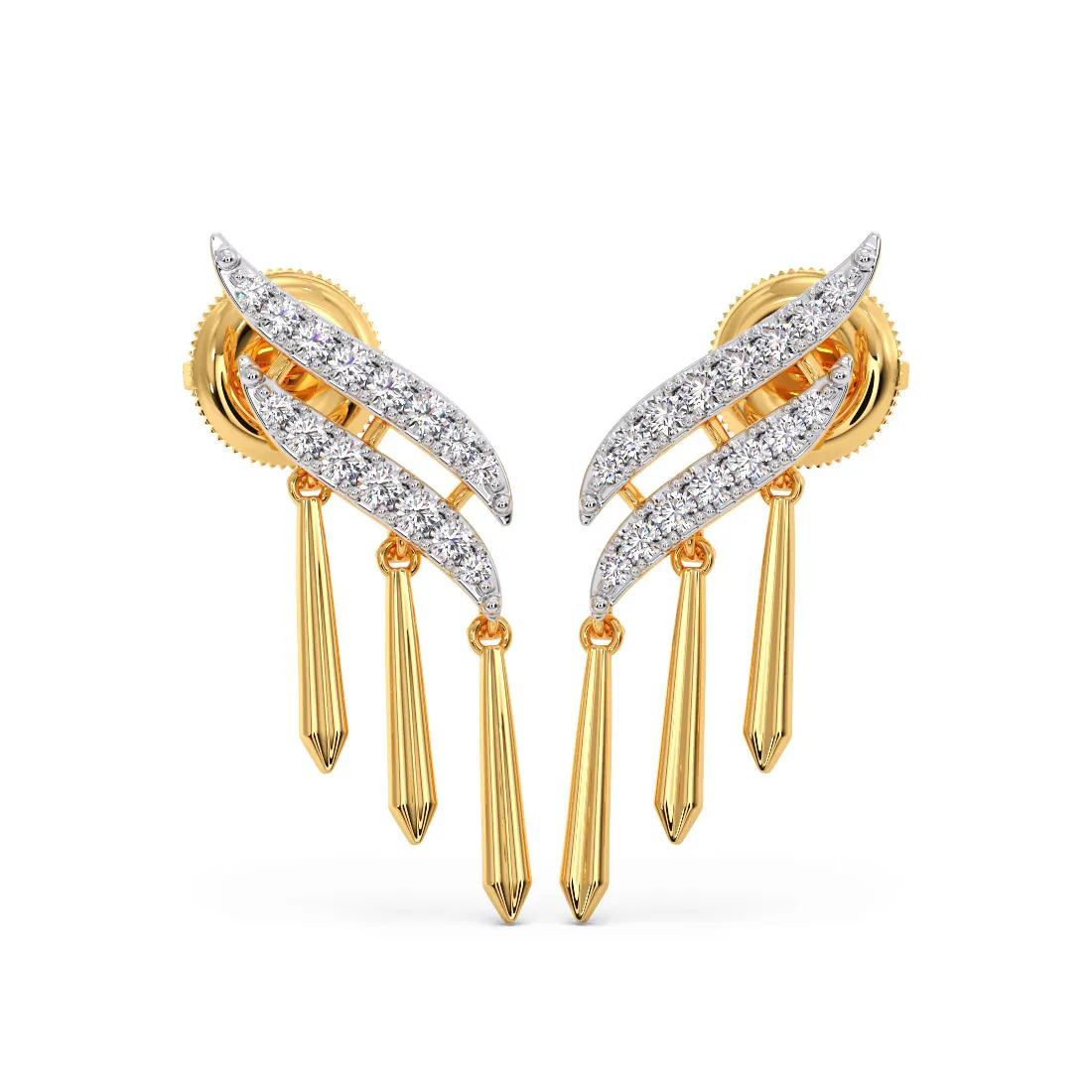 Sleek with a hint of movement, these gold earrings feature layered, curved forms lined with shimmering diamonds. The cascading drop elements add fluidity and elongation, creating a striking yet balanced silhouette. Designed to catch the light with every turn, they bring a refined edge to both occasion wear and elevated everyday styling.