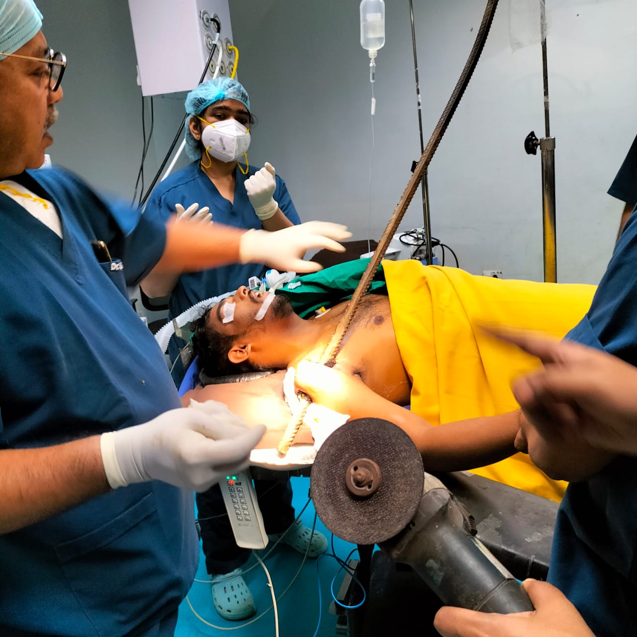 After seeing his condition, he was rushed to the operation theatre & was instantly provided with adequate ice fluids and other medication for pain relief and to stop the bleeding. A large portion of the rod was protruding on each side of the wound, causing extensive injury to the surrounding tissues, muscles, and skin. Due to the exigency, Medica had to arrange for a metal cutter to cut one end of the rod very near the skin so that the other portion could be removed easily. The rod was gently removed, taking complete control of the joint, the primary bone of the upper arm, muscles, and skin to prevent these tissues from any further damage. However, the skin was lacerated and abraded, and the edges of the skin were completely burnt due to the heat of the cutter.
