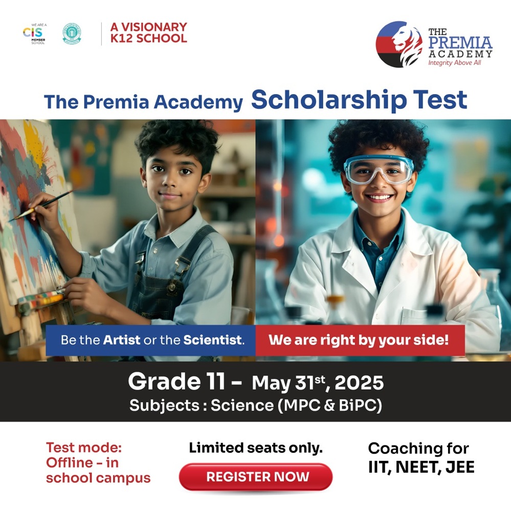 The Premia Academy, a leading educational institution in Hyderabad, has announced a Scholarship Test for Grade 11 Admissions. The test aims to recognize and reward students’ academic potential. It will be conducted on 31st May 2025 at The Premia Academy Campus.